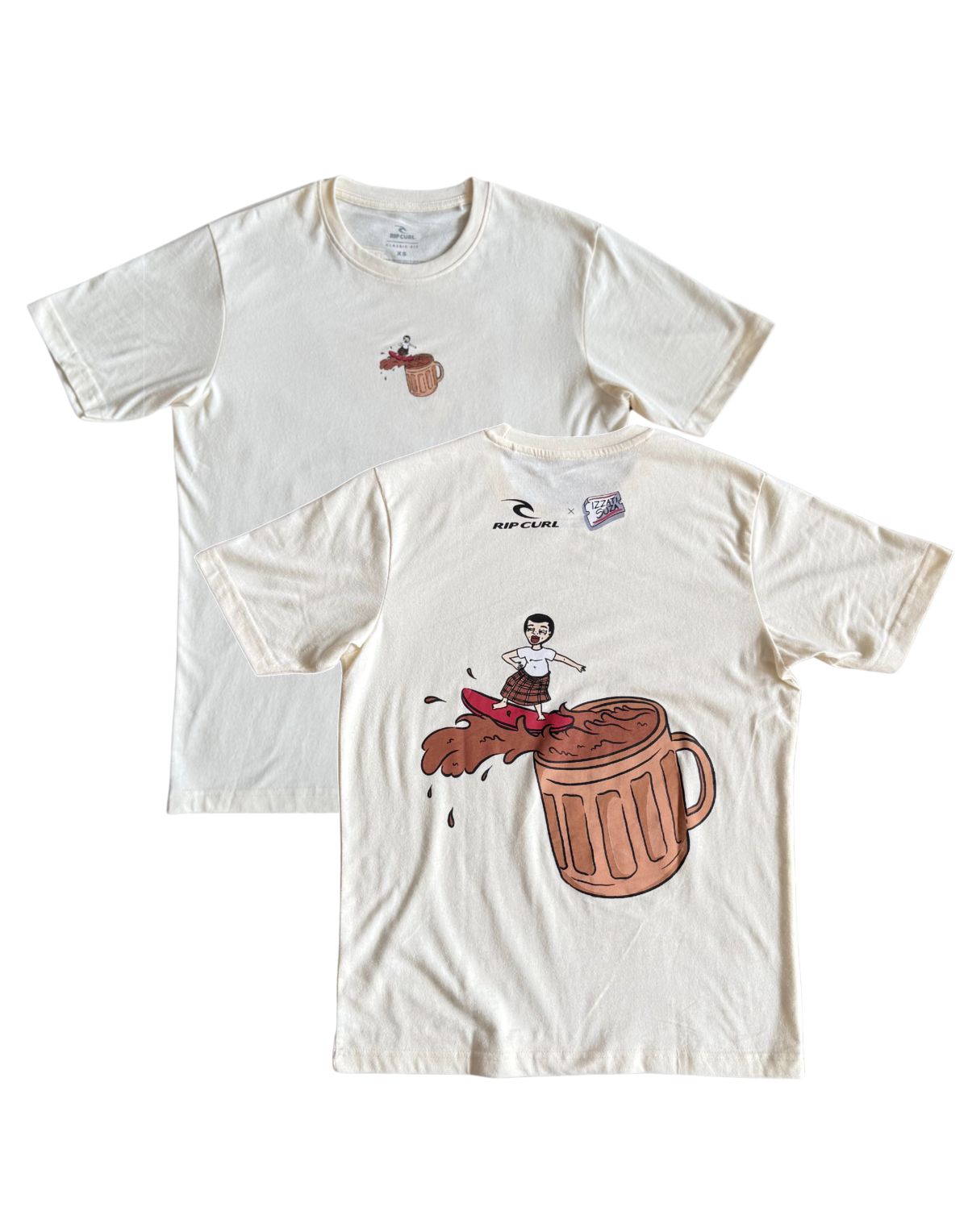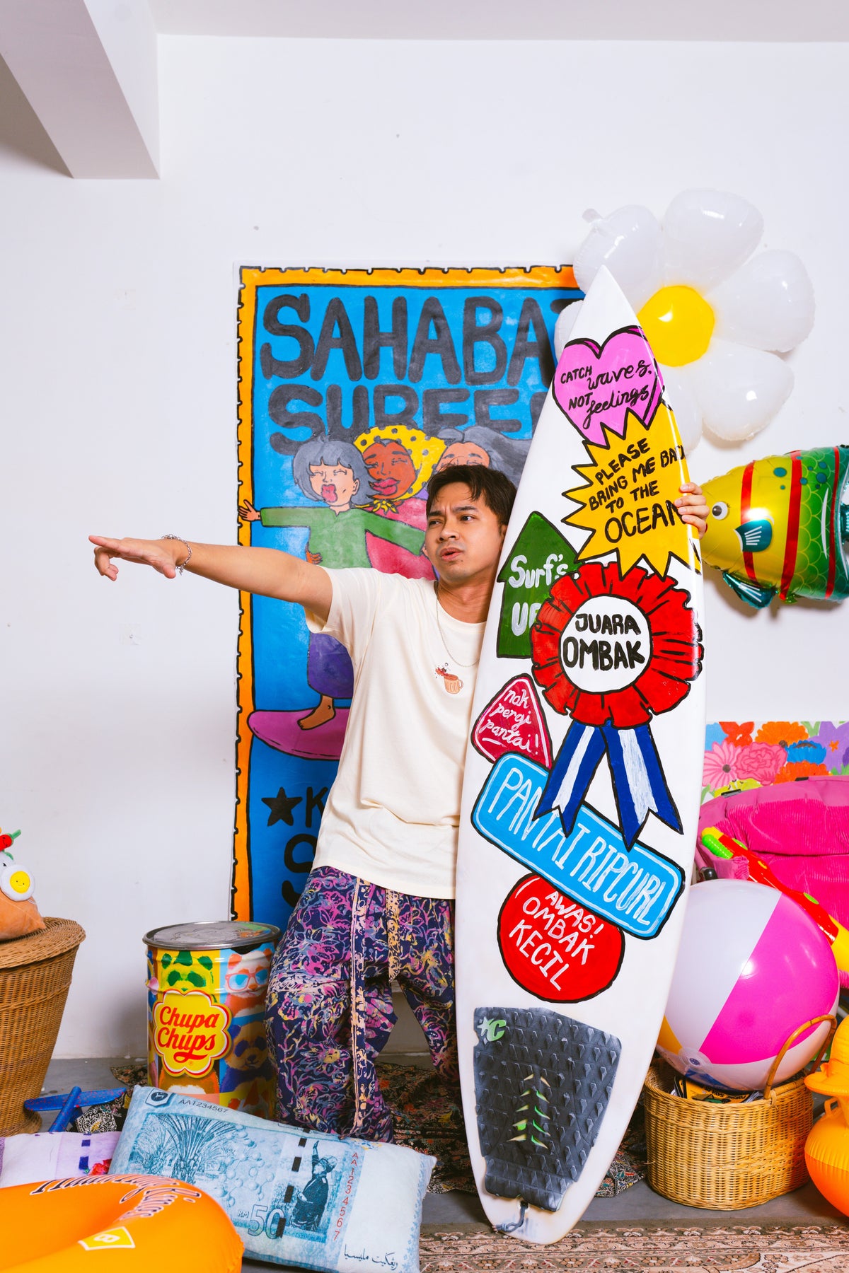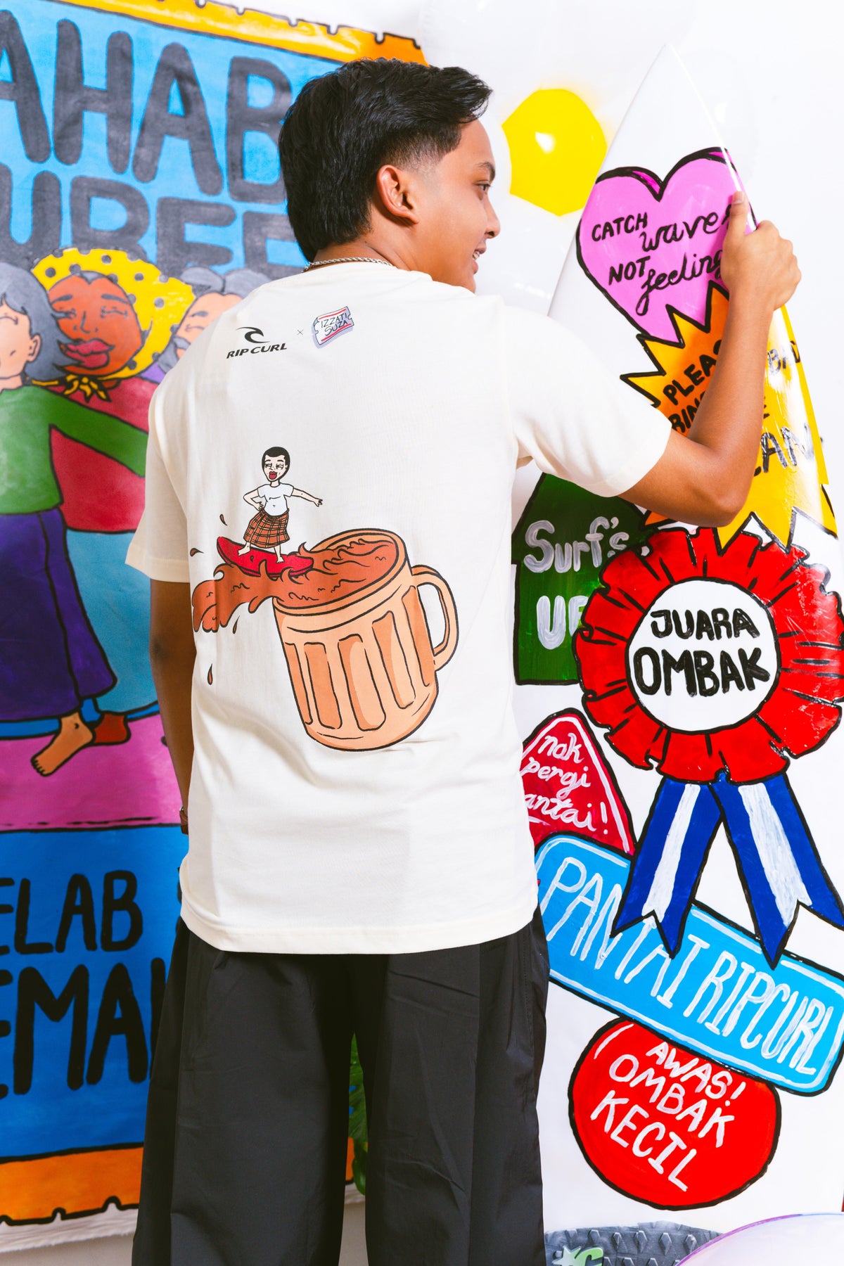 The Pakcik artwork is inspired by our pakciks wearing kain pelikat.Surfing out of the teh tarik.Surfing kaw kaw!